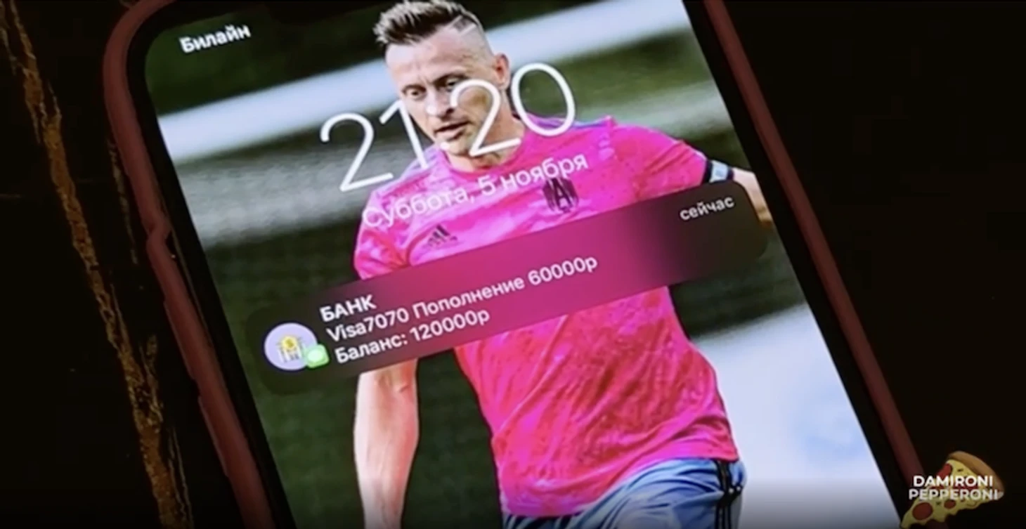 Ролик заканчивается тем, что на телефон форварду приходит уведомление о пополнении банковской карты на 60 тысяч рублей. На экране блокировки у Трегулова фото Сибсканы.