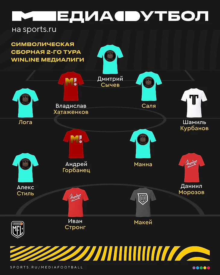 Полузащитники: Алекс Стиль (2Drots), Андрей Горбанец (ФК «Матч ТВ»), Манна (2Drots), Даниил Морозов («Народная Команда»);