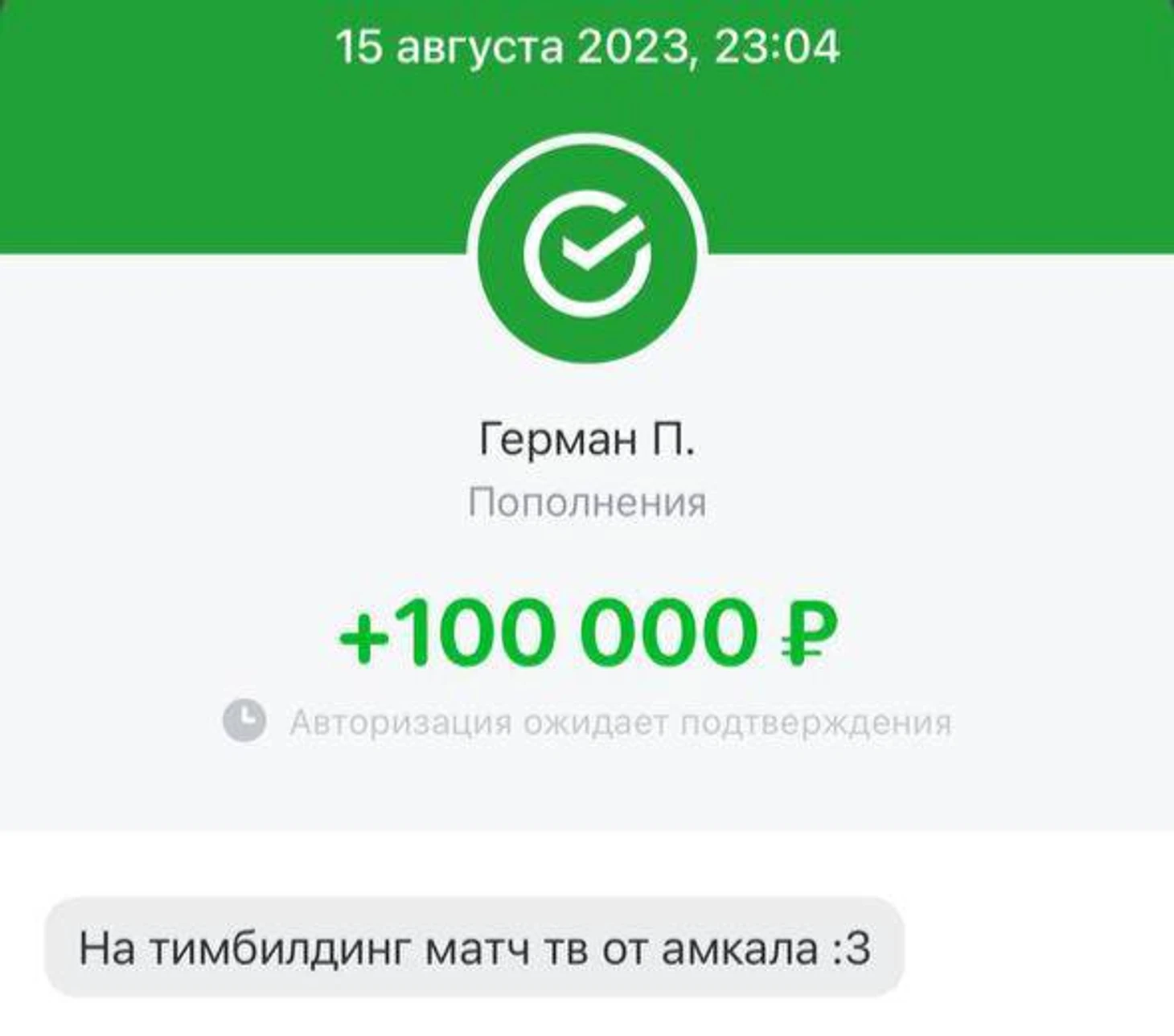 Президент «Амкала» Герман Эль Класико перевел 100 000 рублей с комментарием «На тимбилдинг «Матч ТВ» от «Амкала».