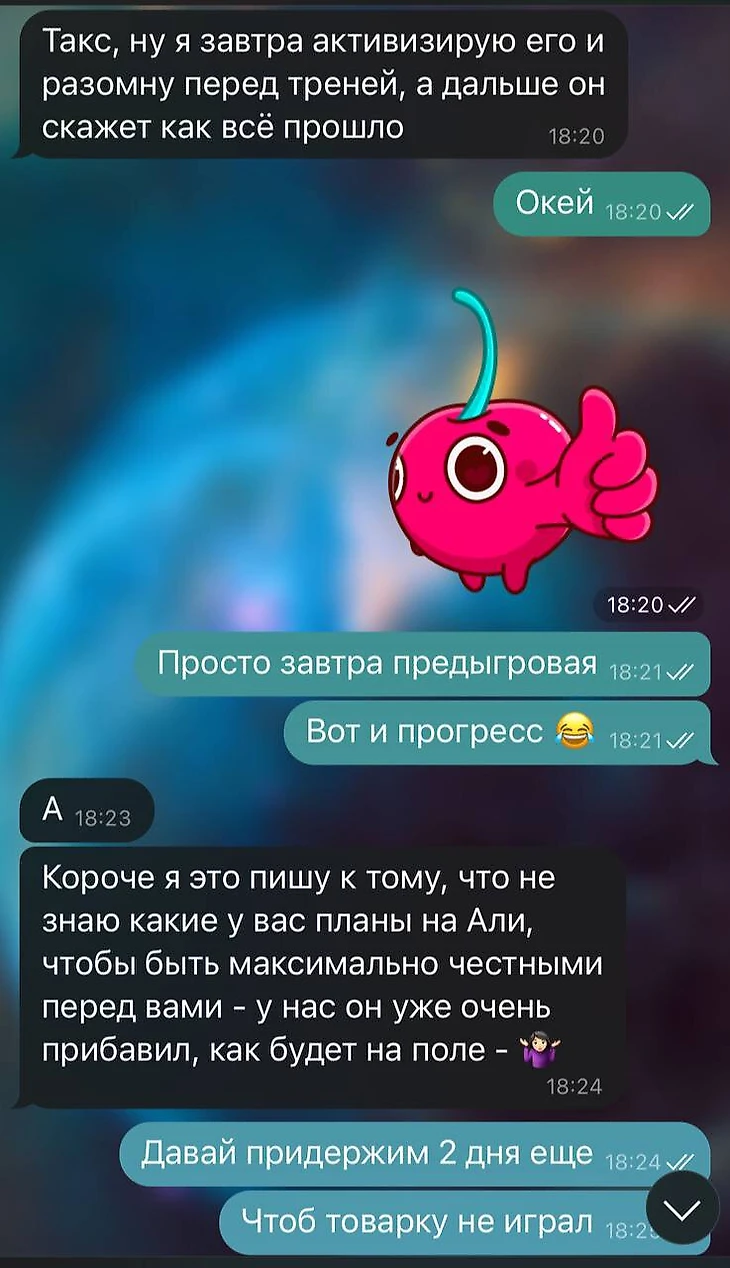 Вот, как выглядит форсирование, пацаны. Игрок пропустил цикл перед товаркой, но был готов уже к дню матча. Чтобы не бросать его в бой, я дал ему дополнительные два дня реабилитации. Кровавый мясник, эдакий», – написал врач «Амкала».