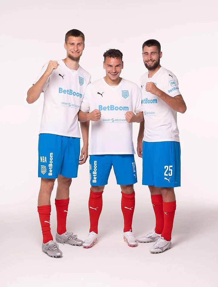 Комплект выполнен в цветах российского триколора: белая футболка, синие шорты и красные гетры.