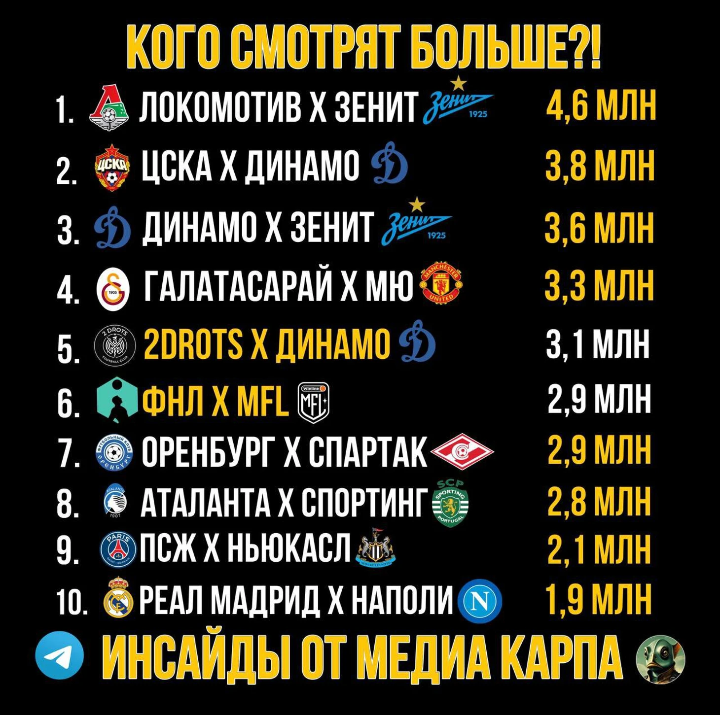 Товарищескую игру 2Drots с «Динамо» на «Матч ТВ» посмотрели 3,1 млн человек.