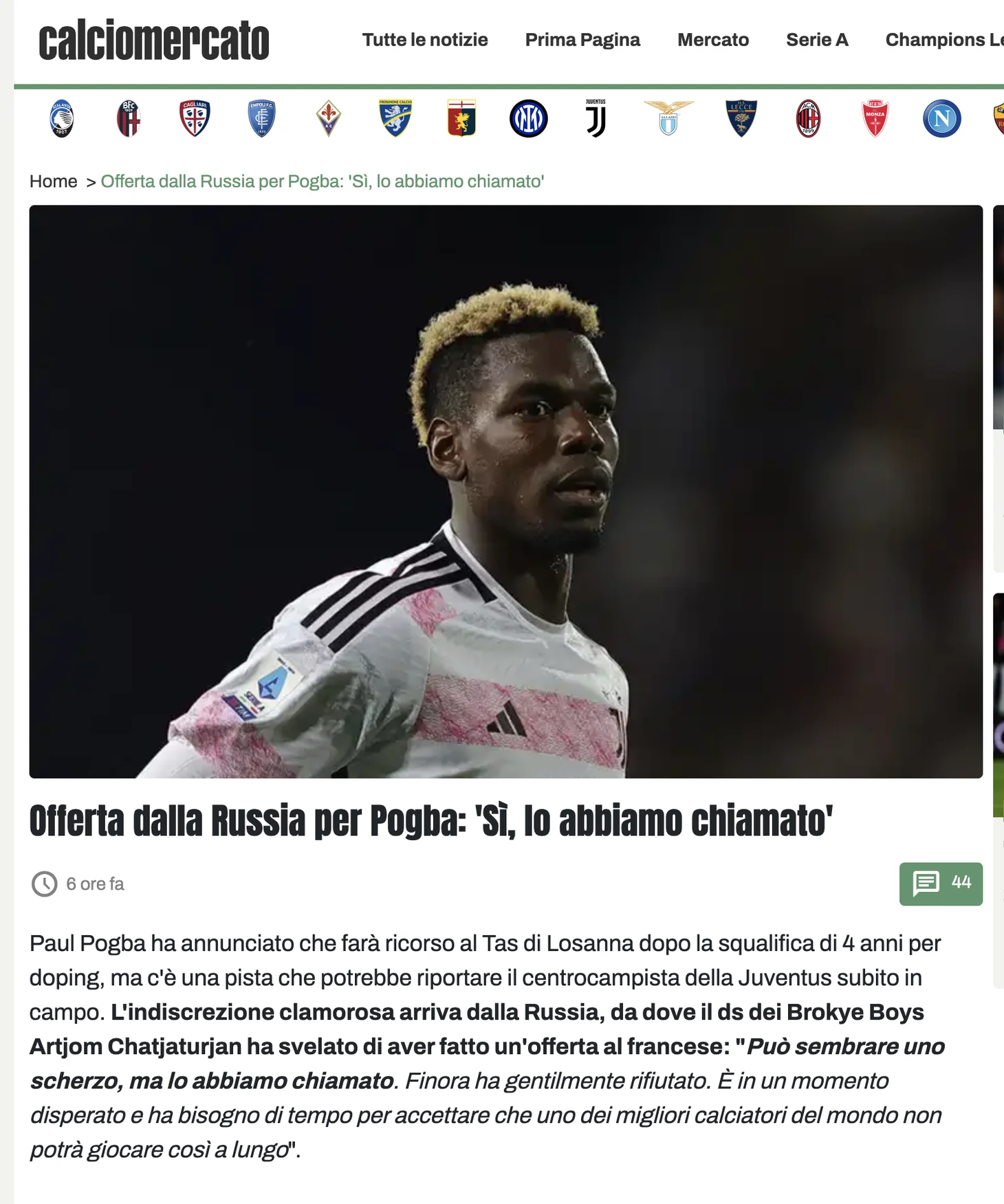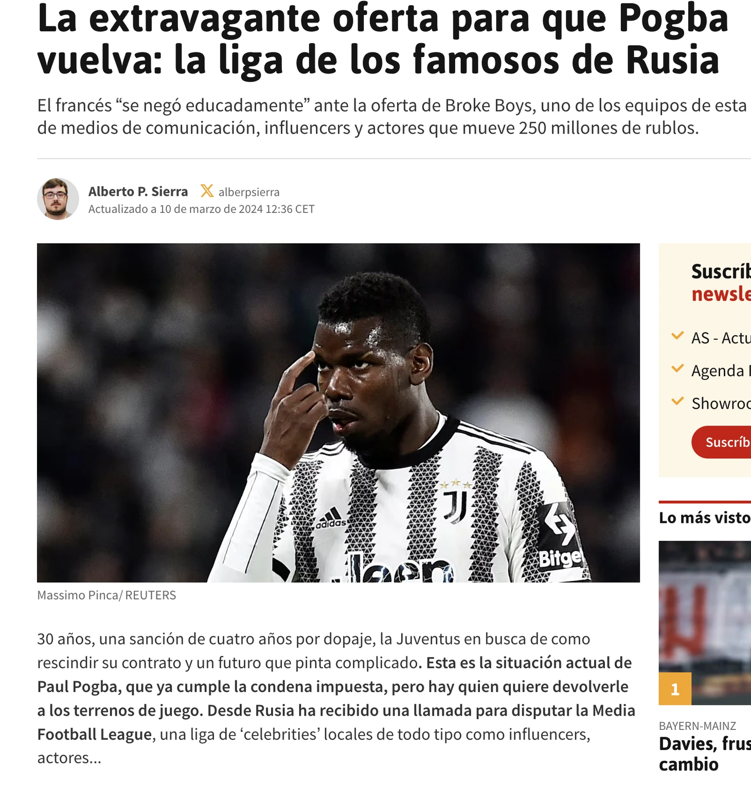 Испанская газета As и итальянский сайт Calciomercato написали о предложении «Броуков» к полузащитнику «Ювентуса». На сайте испанского издания материал вышел под заголовком «Чудное предложение Погба из российской лиги селебрити».