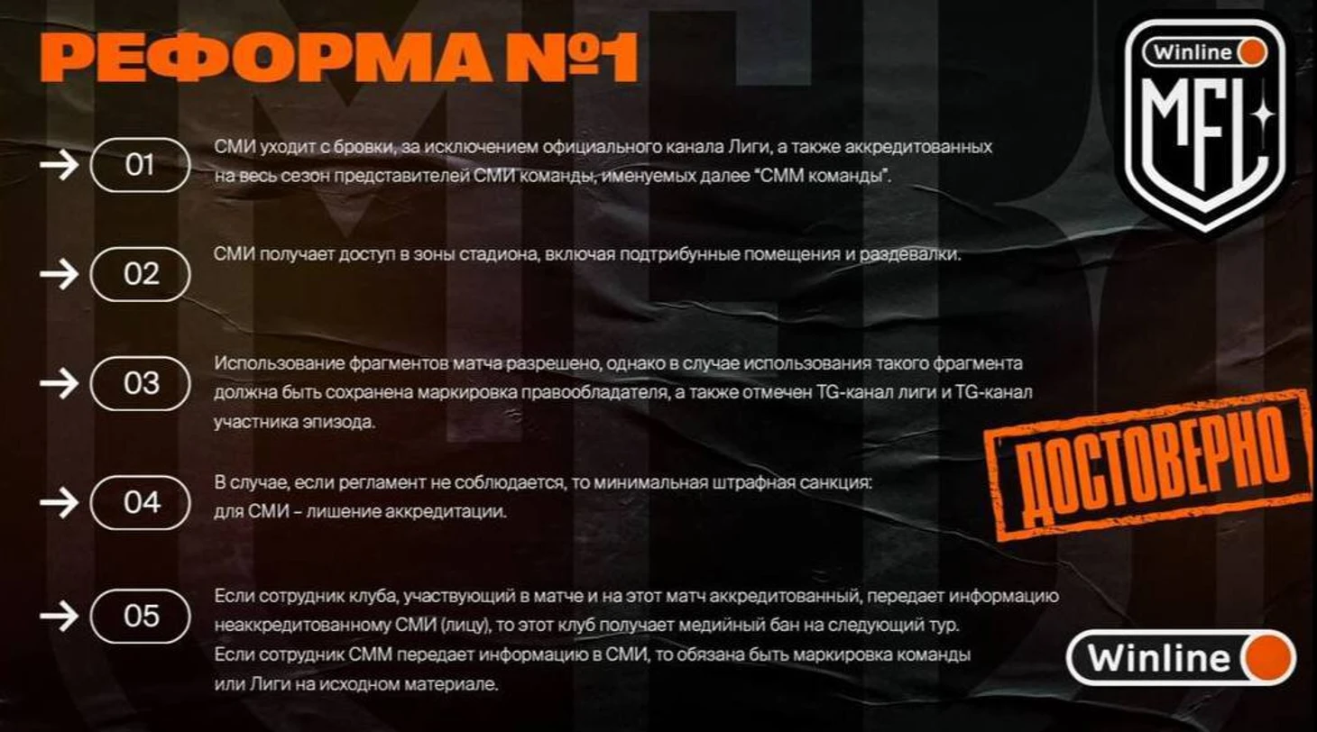 «МФЛ и Николай Осипов выступили с реформой номер 1, касающейся работы СМИ на матчах лиги. Инициативная семерка считает реформу своевременной, полезной, лояльной и дружелюбной по отношению ко всем участникам сообщества. Медиа сохраняют за собой право на использование трансляций, хайлайтов, посещения пространства за воротами, подтрибунных помещений и раздевалок.