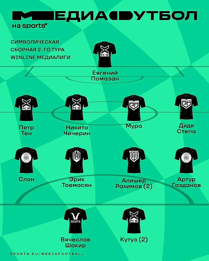 Защитники: Петр Тен (ФК «10»), Никита Чичерин (ФК «10»), Мура («Родина Медиа»), Дядя Степа («Родина Медиа»);