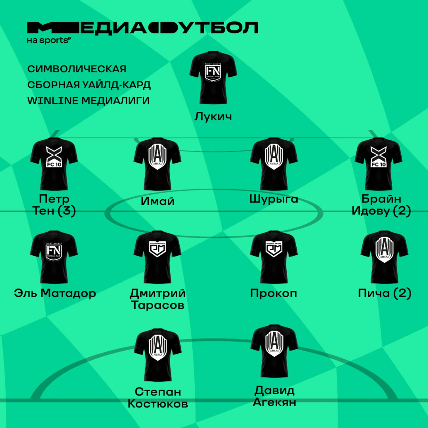 Полузащитники: Эль Матадор (Fight Nights), Дмитрий Тарасов («Родина Медиа»), Прокоп («Родина Медиа»), Пича («Амкал»);