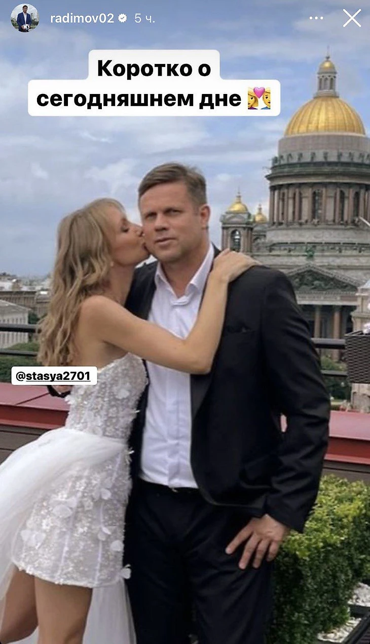 Владислав Радимов опубликовал в сторис инстаграма фотографию, на которой его целует возлюбленная в свадебном платье на фоне Исаакиевского собора. Он сделал подпись: «Коротко о сегодняшнем дне».