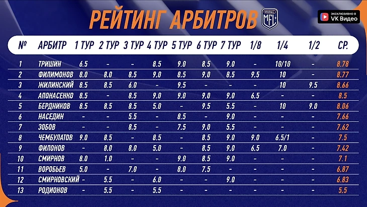 9 баллов получил судья Бердников за игру «Броуки» – «СиндЕкат». Работу Жилинского оценили на 9,5 балла, он поднялся на 3-е место рейтинга
