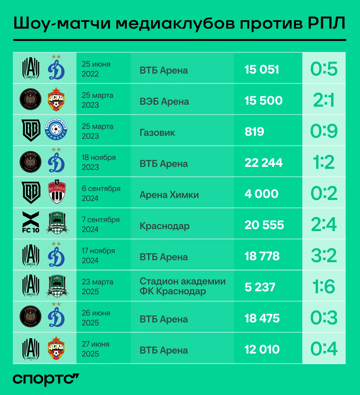 В общей сложности клубы РПЛ провели уже 10 шоу-матчей с медиакомандами и одержали в них 8 побед с общим счетом 38:9.