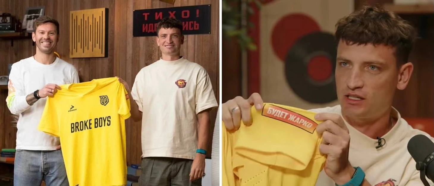 «Майка футбольного клуба «БроукБойз» на Кубок России. «Здесь будет жарко» (читает надпись на рукаве), потому что с Федором Смоловым всегда жарко. Особенно жарко может быть в каких-то определенных частях тела Андрея Аршавина, который понимает, что Смолов его догонит [в «Клубе 100»], а потом это придется как-то комментировать.
