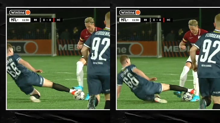 11-я минута матча. Павел Лелюхин из «Броуков» подкатывается в центре поля под Тарасова. «Броуки» считают, что фола нет совсем, потому что Лелюхин играл в мяч. Тарасов требует справедливости и показывает на следы от шипов на голени. Благодаря микрофону на судье мы слышим его объяснение: «Будет карточка желтая, потому что ты не катишься, а прыгаешь». Но игроки «На спорте» требовали красную, судья пошел смотреть повтор. Одного просмотра ему хватило, чтобы изменить решение: «Мне не надо больше повторов, это красная карточка». Лелюхин был удален.