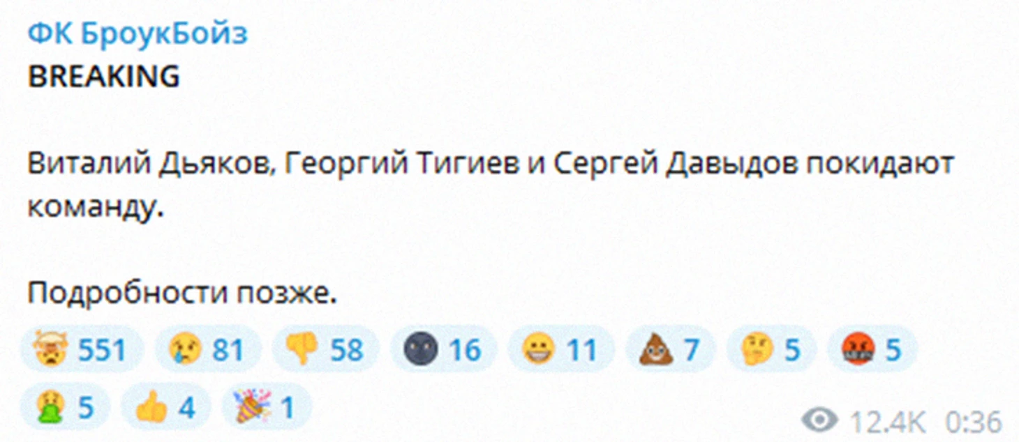 Виталий Дьяков, Георгий Тигиев, капитан команды Сергей Давыдов и играющий главный тренер Антон Соснин покинули «БроукБойз». Такое сообщение из телеграм-канала команды разорвало инфополе медиафутбола в ночь со среды на четверг.