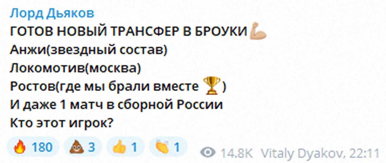 В 22:41 Виталий Дьяков у себя в телеге анонсирует переход в «БроукБойз» нового игрока.