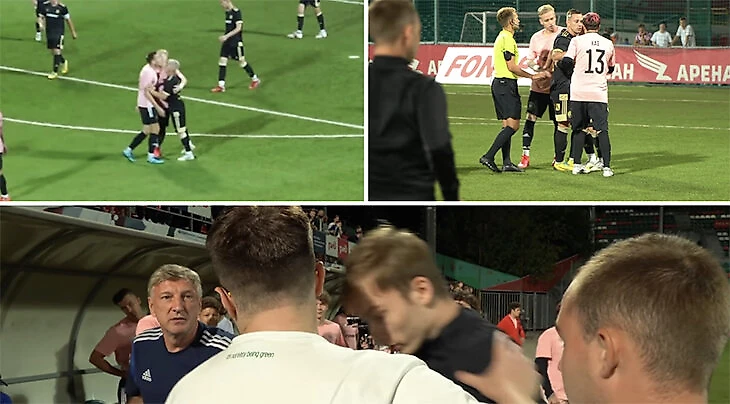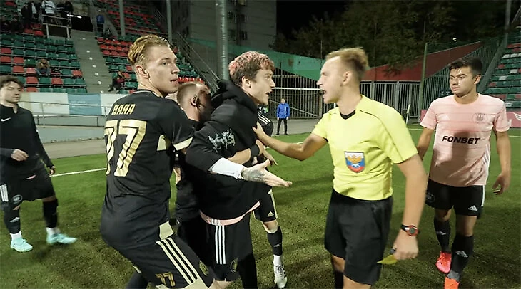 Затем все переместилось на скамейку запасных. Вратарь 2D Белка ругался с резервным судьей, за арбитра вступился доктор «Амкала» Артем Рыженко. Снова началась потасовка. Досталось и оператору. Но после игры все перед всеми извинились.