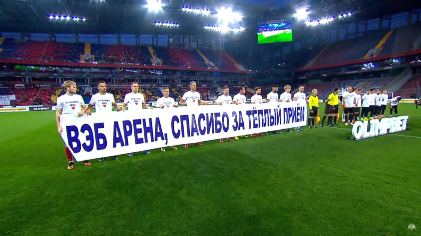 А Reality всех отблагодарили: вышли в футболках с благодарностью к МКС и развернули баннер с надписью: «ВЭБ Арена», спасибо за теплый прием».