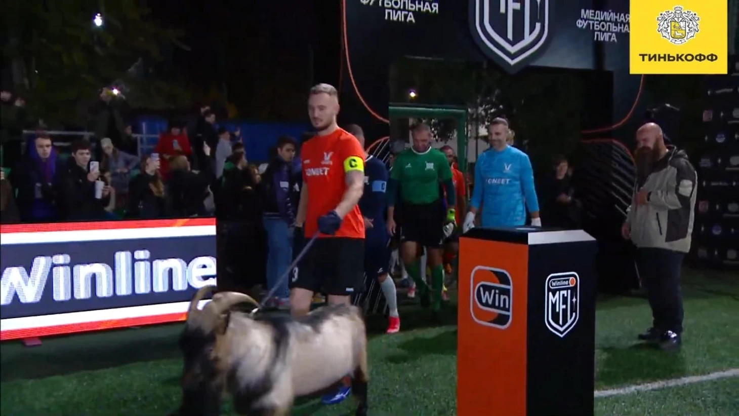 Во-вторых, выход на поле. Посмотрите, капитан Goody идет с настоящим козлом на поводке. Красиво!
