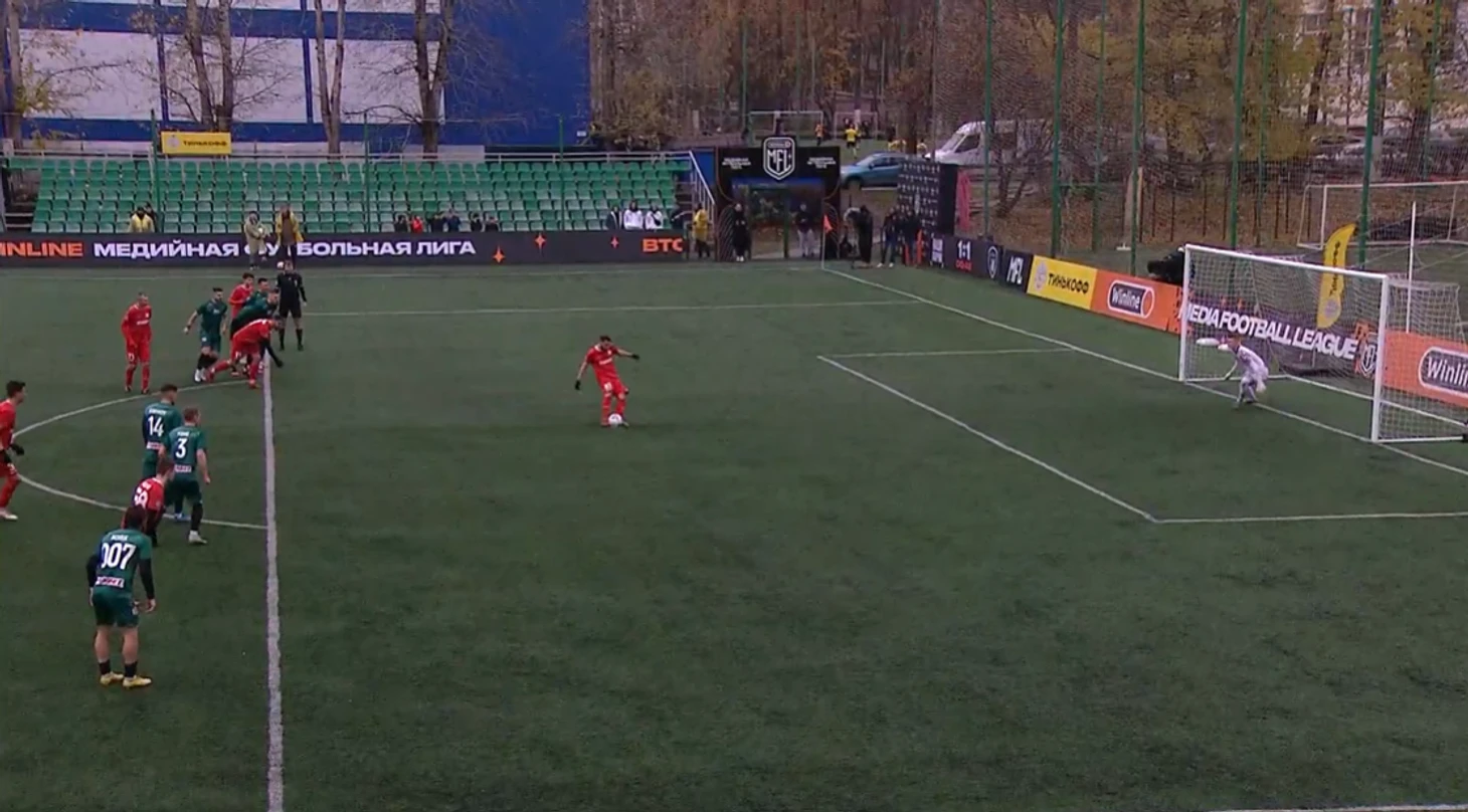 Казанков снова пошел к точке. Со второй попытки он забил, но Тришин вновь направился к телеку – на этот раз Гасилин вбежал в радиус штрафной до удара Казанкова, что тоже является нарушением.