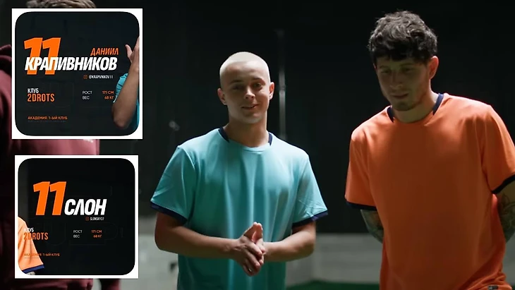 Еще один нюанс. В состязании 1 на 1 очень важна антропометрия игроков, потому что с помощью своих данных они стараются обыграть оппонента. Высоким сложнее против техничных маленьких, а большой может оттеснить малыша. Перед стартом матча Крапа и Слона появилась плашка с их данными. По версии МФЛ, рост обоих – 171 сантиметр. Хотя уже на следующем кадре видно, что Слон ощутимо выше.