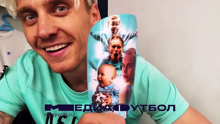 В раздевалке Гудай светился от счастья. Сначала танцевал и исполнил песню группы «Ленинград», а после – успокоился и показывал кастомизированные щитки с изображением жены и детей.