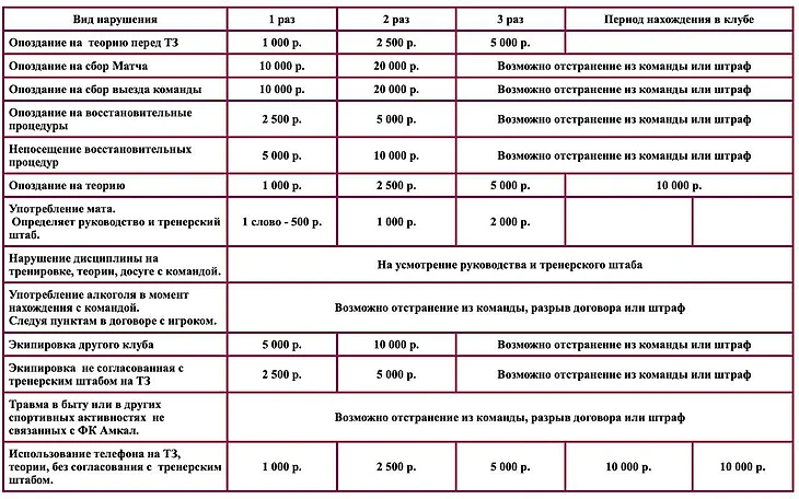Под запрет попали алкоголь, мат и опоздания. Еще нельзя приходить на тренировку в экипировке других клубов. В случае рецидива штраф увеличивается. Вот полный список запреток.