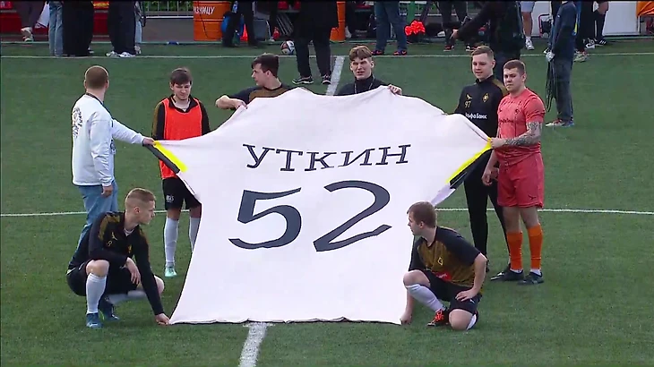 Перед выходом команд «Эгриси» вынесли на поле огромную футболку. На лицевой стороне – «Играйте в футбол», коронная фраза Уткина, которая с этого сезона нанесена на форму клуба. На обратной – фамилия Уткина и номер 52, его возраст.