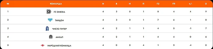 После пяти туров у «Народной» ноль очков, но математические шансы на третье место остаются. Пока что DMedia (9 очков), «Тандем» (8) и «Чисто Питер» (7) распределяют места в плей-офф.