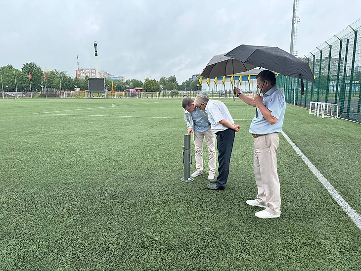 Шинкаренко: «Приезжал сертифицированный специалист из РФС. Аппаратом проверял отскок мяча, количество крошки на квадратный метр поля, глубину засыпки крошки, высоту ворса и размер поля.