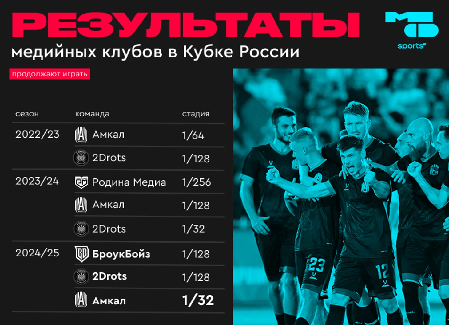 ● 2Drots первыми из медийных запрыгнули в 1/32 – в сезоне-2024/24. Тогда они легко прошли команды Второй лиги: «Муром» (3:1), «Сахалин» (2:0) и «Динамо» Киров (2:0). Но срезались на Химках из Первой лиги (0:2).