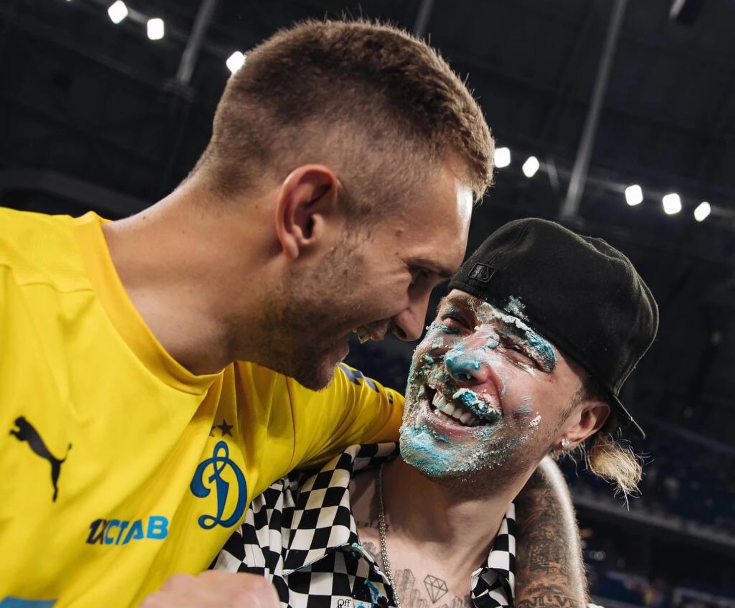 После матча продолжилось празднование дня рождения Крида. На поле вынесли торт: Игорь Лещук схватил кусок и размазал по лицу Крида. Защитник «Амкала» Арсений Левшук выручил – отдал музыканту свою футболку протереть лицо.