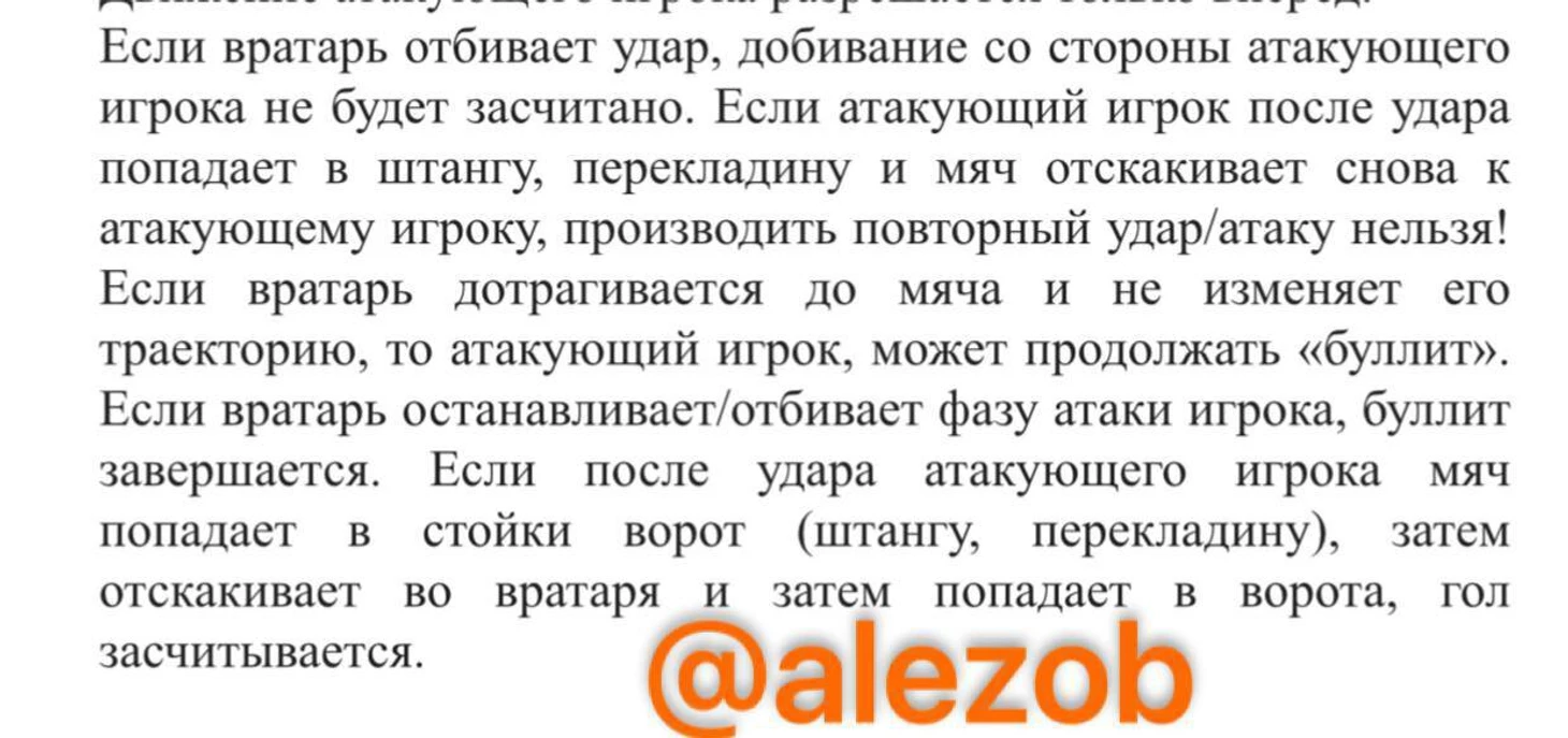После завершения матча арбитр Медиалиги Максим Зобов опубликовал в телеграме фрагмент регламента – как раз про исполнение буллитов. Важно – правил турнира нет в публичном доступе, для команд лига проводит закрытые разборы перед стартом сезона. Что же написано в регламенте?