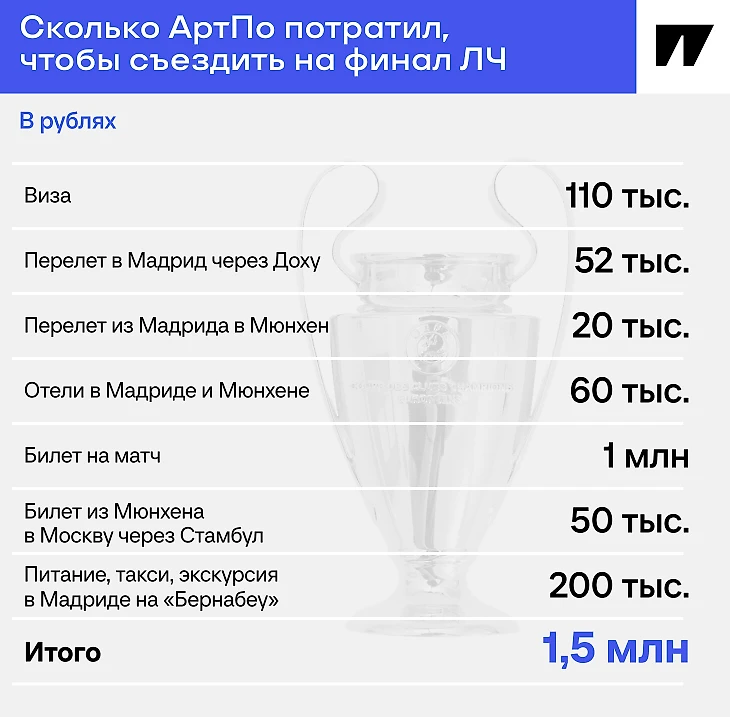 Дорога в Мюнхен была сумасшедшей. 26 мая в обед мы вылетели из Москвы в Доху. 27-го в 9 утра были в Мадриде. Через три дня, 30 мая, вылетели в Мюнхен. Получилось дорого: виза – 110 тысяч, перелет до Мадрида – 52, в Мюнхен – еще 20. Обратный билет в Москву через Стамбул – 50. Плюс проживание – еще 60 тысяч на каждого за два города. Еще были расходы на питание, такси, экскурсию в Мадриде на «Бернабеу». Итог – примерно 1,5 миллиона (включая билет).