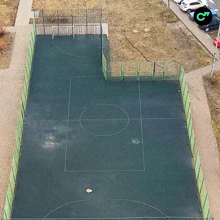 Крутость площадки не в том, как она появилась. Там все ясно – коммунальщики меняли трубы под большой прямоугольной площадкой: вырыли, провели работы, закопали и, видимо, испортили покрытие. Это окей. Но больше всего меня улыбает, что кто-то абсолютно спокойно, не обращая ни на что внимания, обнес это забором. Это самое великое решение. Ладно бы они просто оттяпали часть поля. Но они обнесли забором оставшееся покрытие. Возможно, человек думал, что так и должно выглядеть футбольное поле, потому что никогда его не видел. Или он вообще не включал мозг.