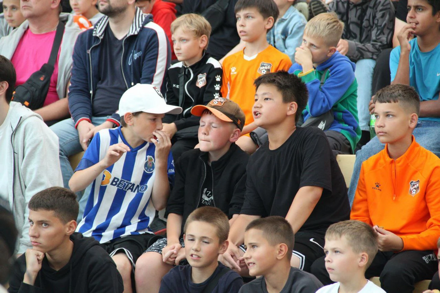 Сразу бросается в глаза, что много людей в спортивных джерси. Преобладают оранжевые футболки «Урала», но есть и человек в майке сборной Аргентины.