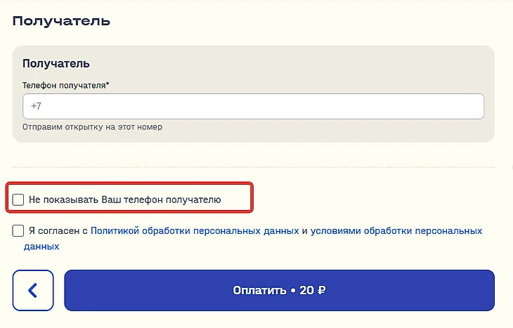 На картинке: ввод номера телефона получателя, красным выделено поле, в котором можно поставить отметку и получатель не узнает от кого получил билет