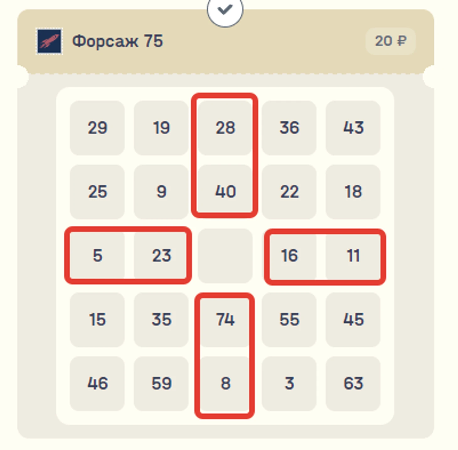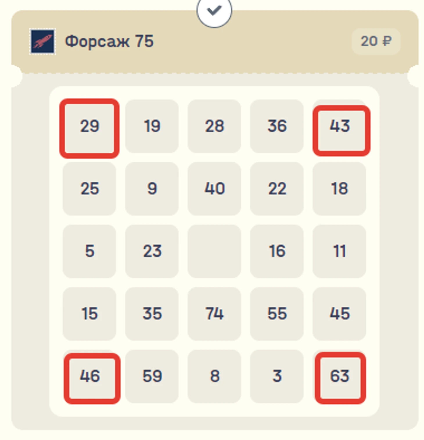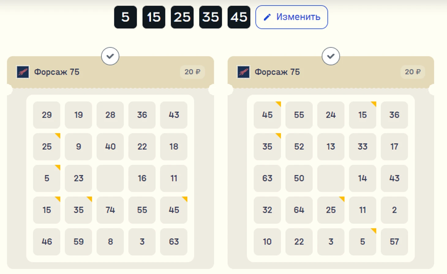 Лотерея «Форсаж 75» предлагает опцию «Свои числа». При выборе игровых купонов можно указать от 1 до 5 чисел, которые должны быть в купоне. На странице будут отображаться только те купоны, в которых есть указанные значения.