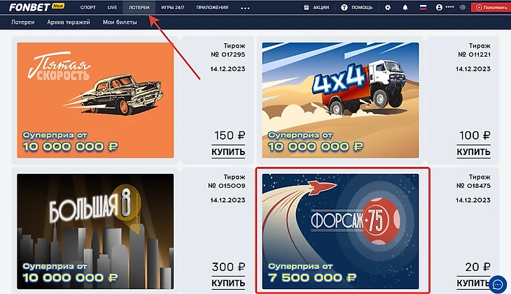 На картинке: сайт букмекерской конторы Фонбет, стрелка указывает на раздел Лотереи на горизонтальной панели управления, красным выделена лотерея Форсаж 75