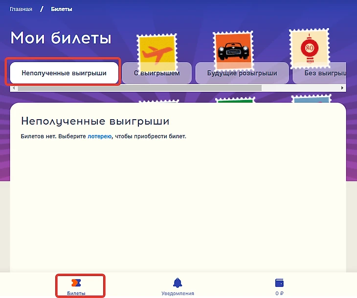Для получения результатов игры необходимо выбрать «Неполученные выигрыши» и проверить, если ли там билеты.