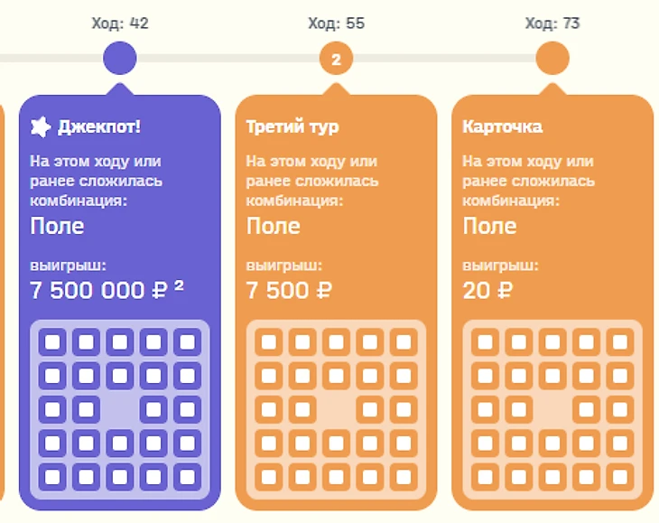 В лотерее шесть комбинаций, которые приносят выигрыш. Процесс розыгрыша проходит по турам. Всего в игре шесть этапов.