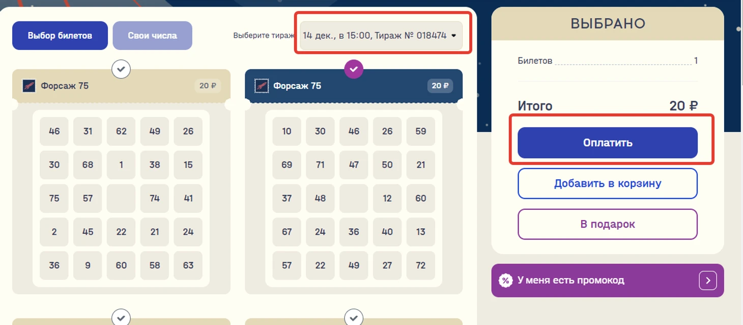 На картинке: выбранный билет для покупки, красным выделено выбранный тираж и кнопка Оплатить для покупки билета