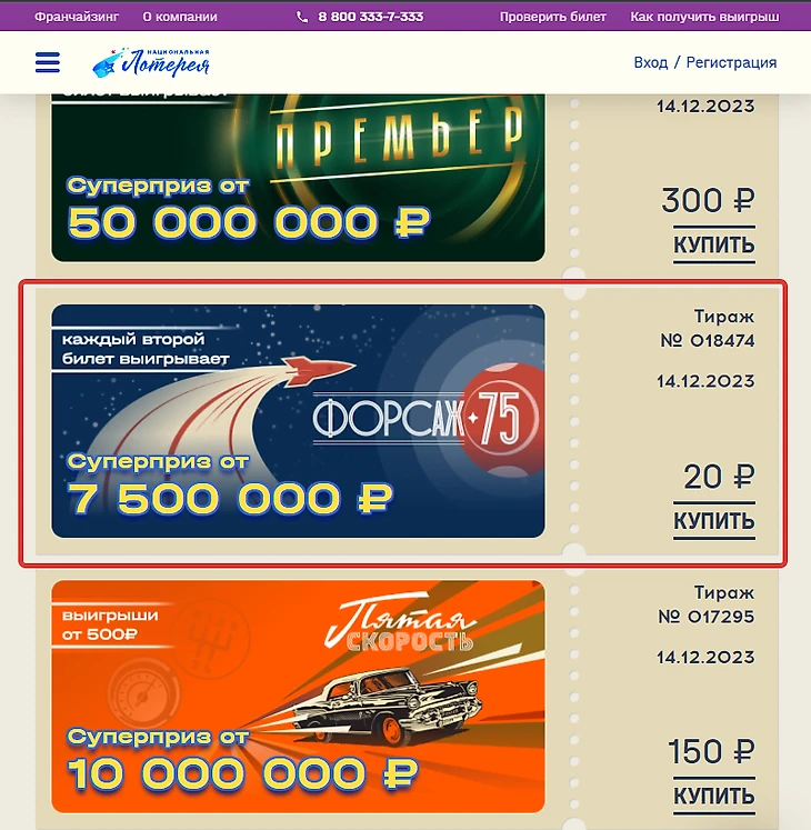Для приобретения билета необходимо перейти в раздел «Лотереи» и выбрать «Форсаж 75» их общего списка.