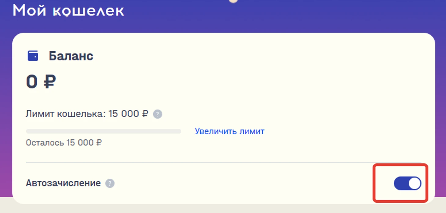 На картинке: кошелек Национальной лотереи, красным отмечен виджет для подключения автозасления выигрышей до 14 999 рублей