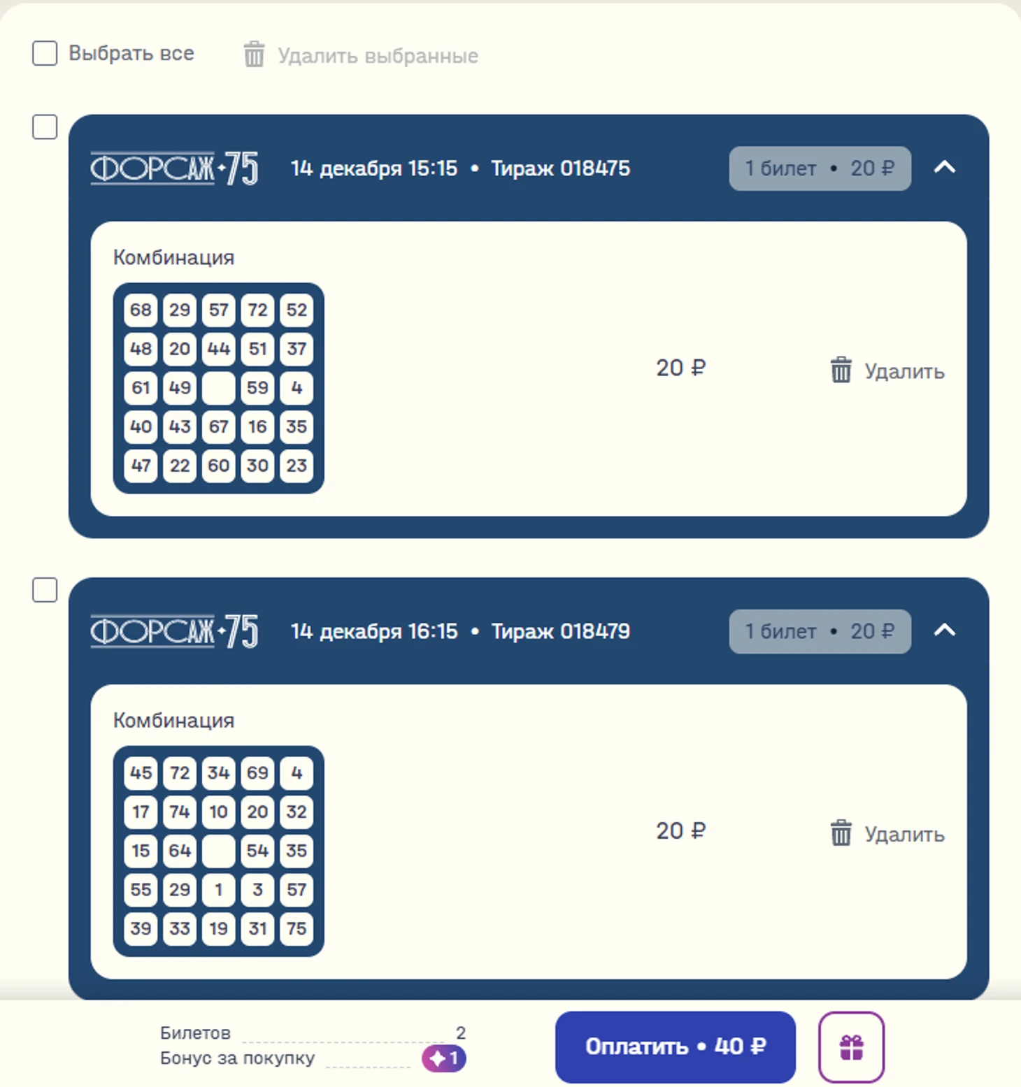 На картинке: покупка двух лотерейных билетов Форсаж 75 на разные тиражи через корзину