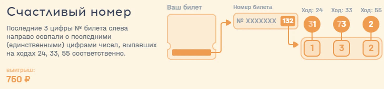 Шестой этап розыгрыша — «Счастливый номер». В рамках дополнительного розыгрыша можно получить 750 рублей. Из чисел, выпавших на 24, 33 и 55 формируется комбинация, состоящая из последних или единственных цифр шара. Билеты, в которых это комбинация встречается слева направо в трех последних числах номера получают выигрыш.