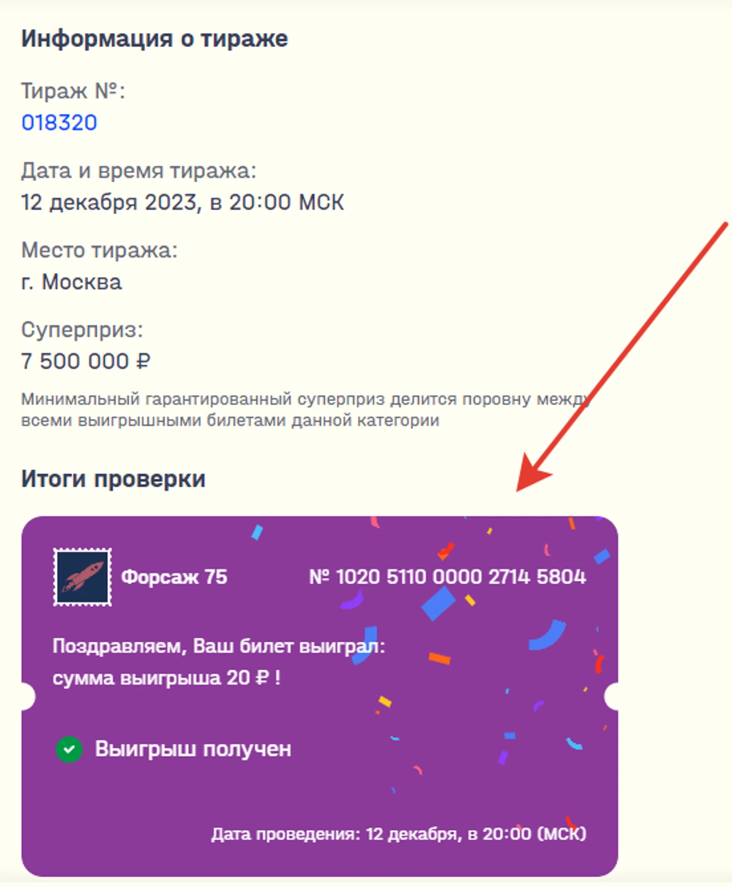 В новом окне появится информация о тираже, дате его проведения и результатах игры для конкретного билета.