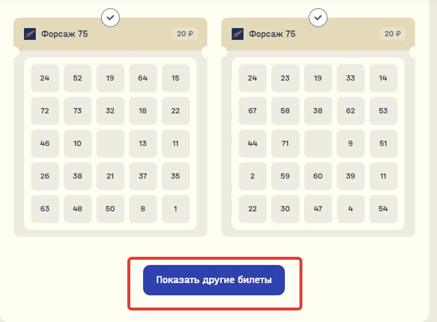 На странице с лотерей будут представлены варианты билетов. Они уже заполнены. Если вас не устраивают представленные комбинации, то необходимо нажать на кнопку «Показать другие билеты». Страница с игровыми купонами обновится и будут показаны другие комбинации. Если вы уже выбрать один или несколько билетов, то они сохранятся.