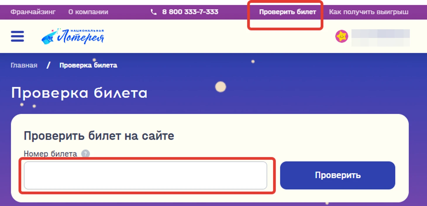 На картинке: проверка выигрышного билета, красным выделена кнопка на панели управления для перехода в раздел и поле для ввода номера билета