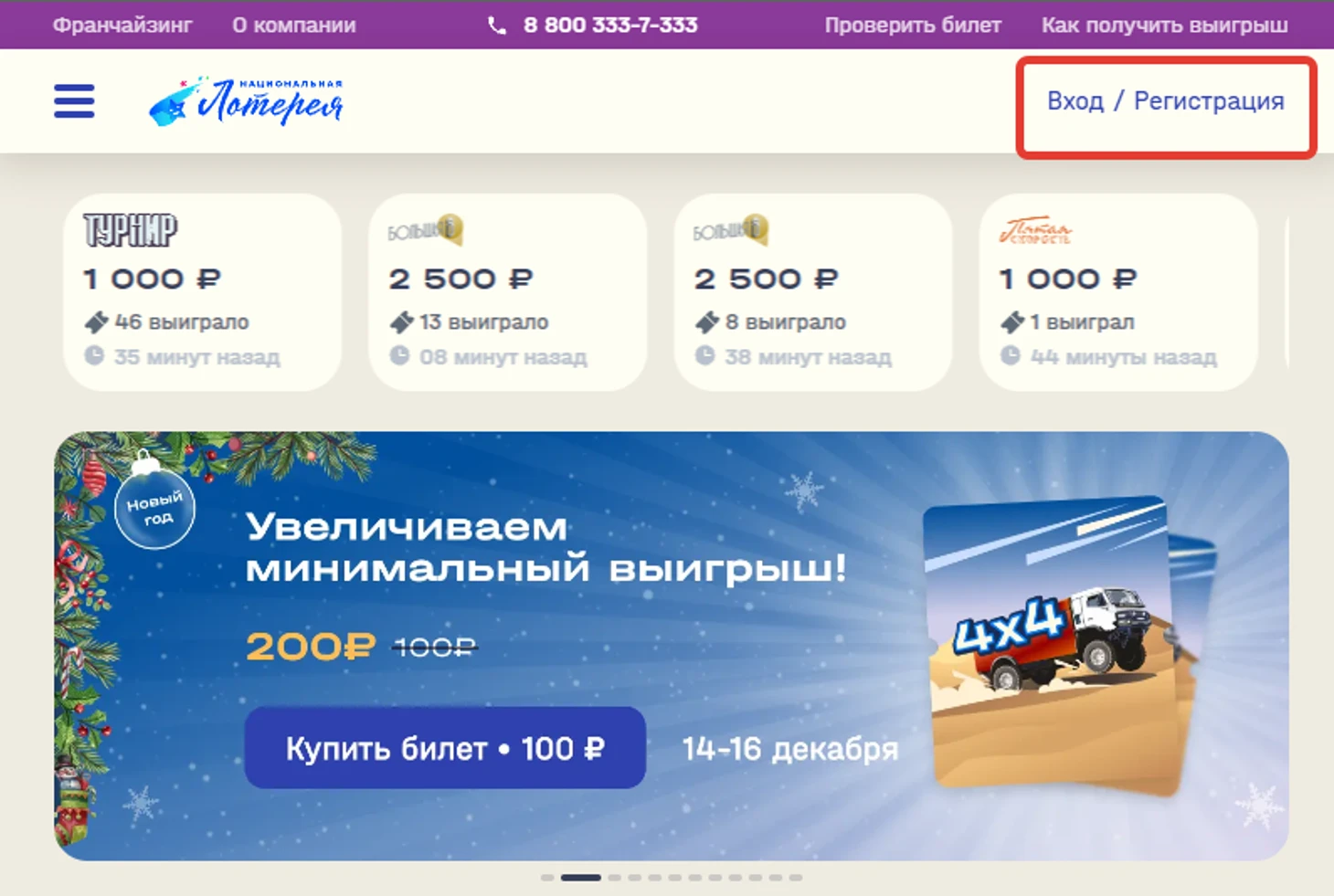 На картинке: главная страница сайта Национальная лотерея, красным выделена кнопка Вход/Регистрация для авторизации или создания учетной записи