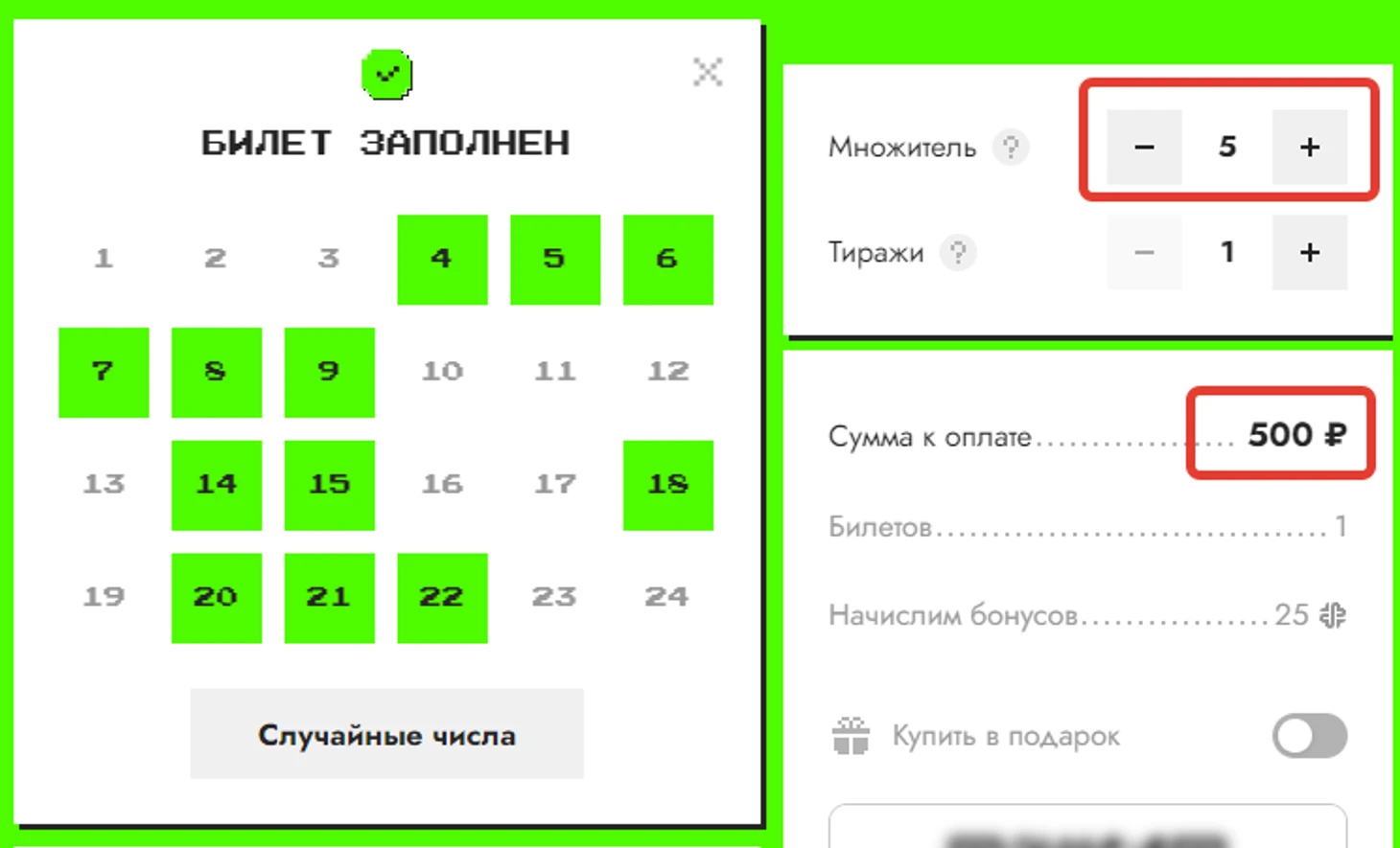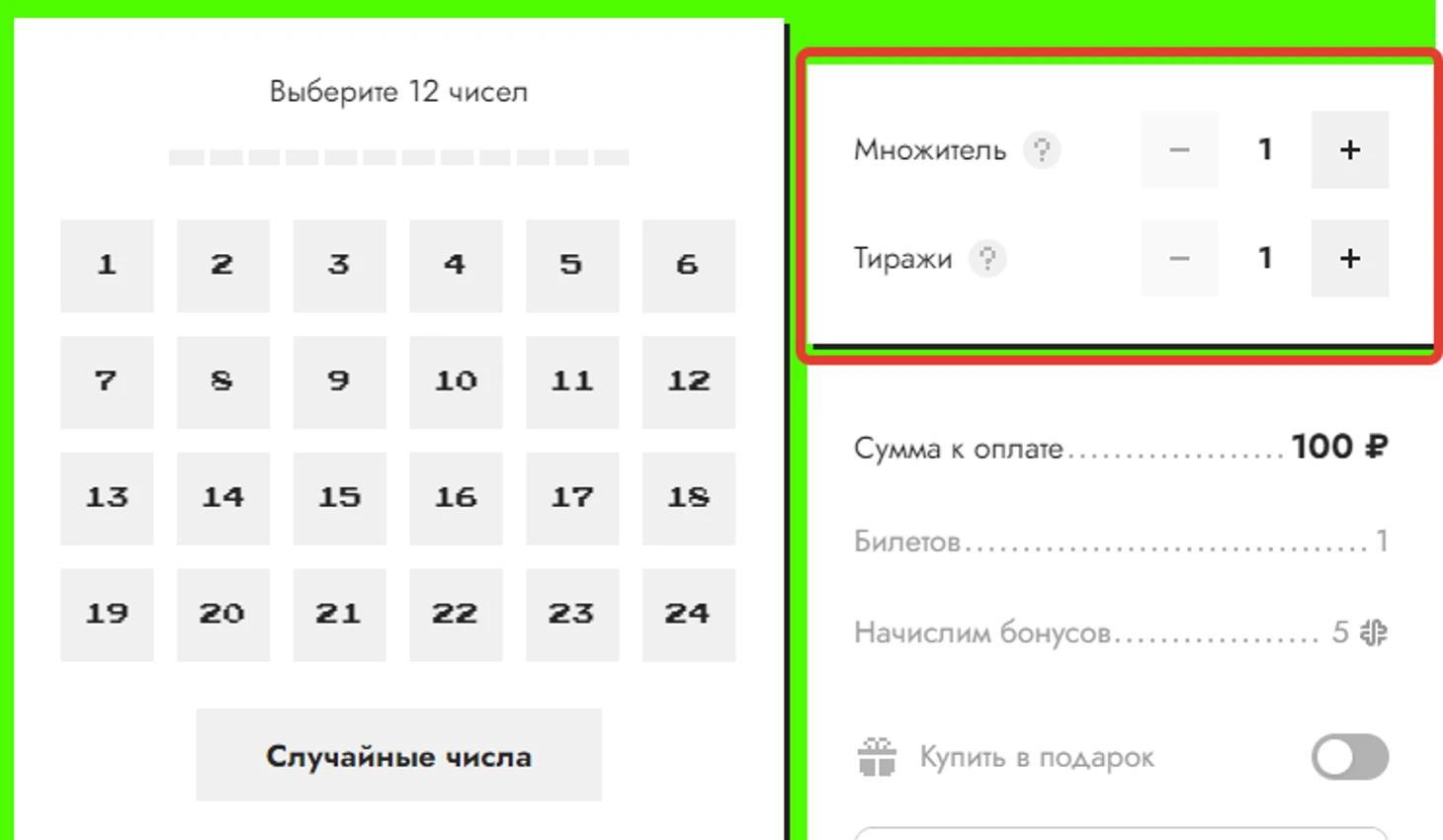 Опция «Множитель» позволяет увеличить фиксированные призы, не распространяется на суперприз. При выборе множителя увеличивается и стоимость билета. Итоговая цена купона равняется произведению базовой стоимости на выбранный множитель.