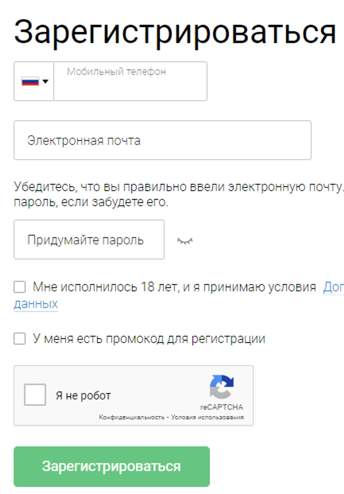 Номер мобильного телефона подтверждается кодом из СМС-сообщения. Для завершения процесса необходимо согласиться с правилами работы сервиса и подтвердить, что вы не робот. Минимальный возраст игрока для регистрации — 18 лет.