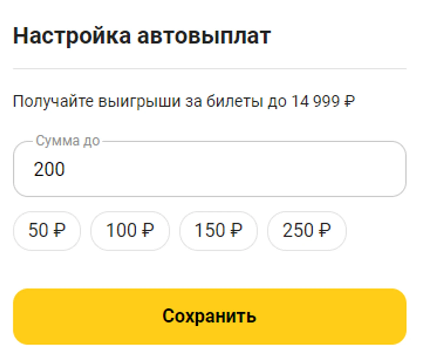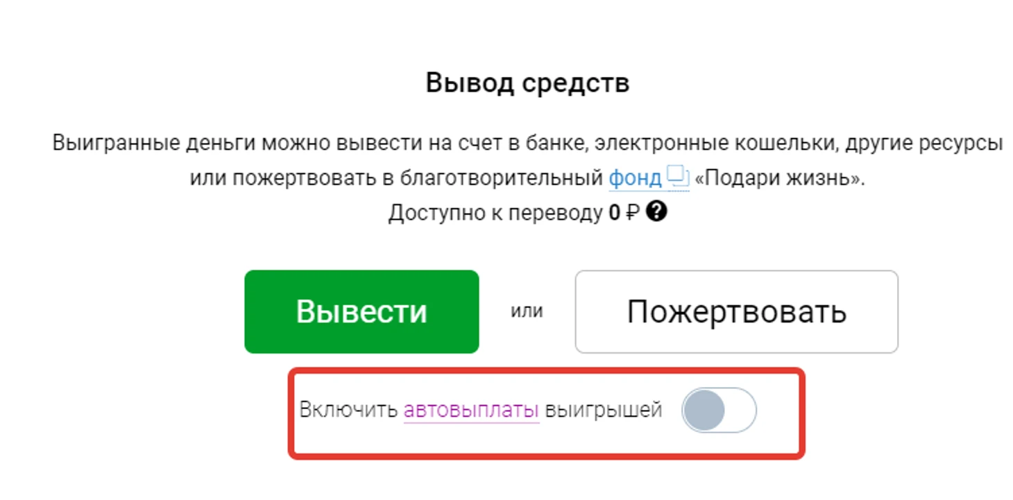 Все выигрыши в лотереи до 15 000 рублей можно получать в автоматическом режиме. Для получения денег необходимо перейти в личный кабинет, выбрать раздел «Кошелек» и активировать виджет «Включить автовыплаты выигрышей».